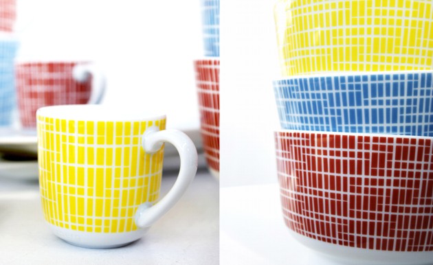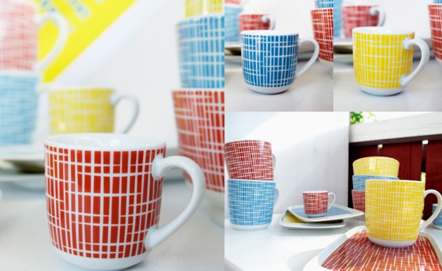 Eine gelungene Kombination von Farbe und Form bestehend aus Becher, Espressotasse, Müslischale und dem Frühstücksteller in eckiger Form.